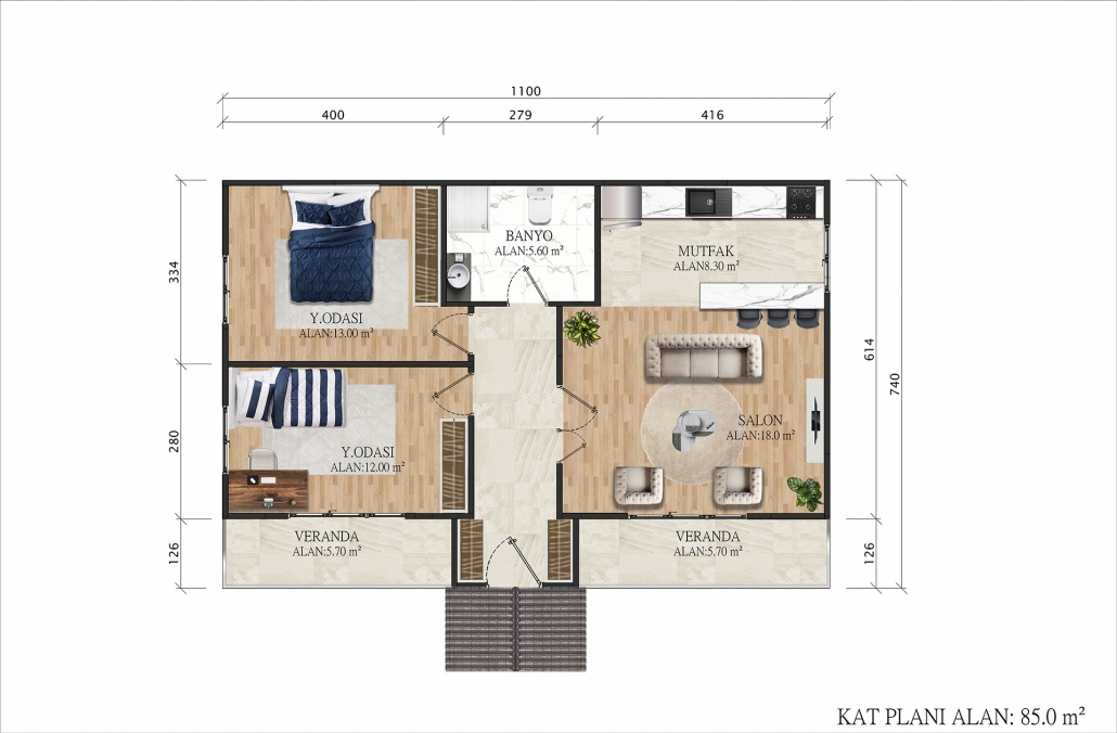 Hızlı montaj süreci ve düşük bakım maliyeti ile 85 m² Tek Katlı Prefabrik Ev, yazlık, daimi konut veya misafir evi olarak rahatlıkla tercih edilir. İç ve dış tasarım müşterinin ihtiyaç ve zevkine göre özelleştirilebilir.