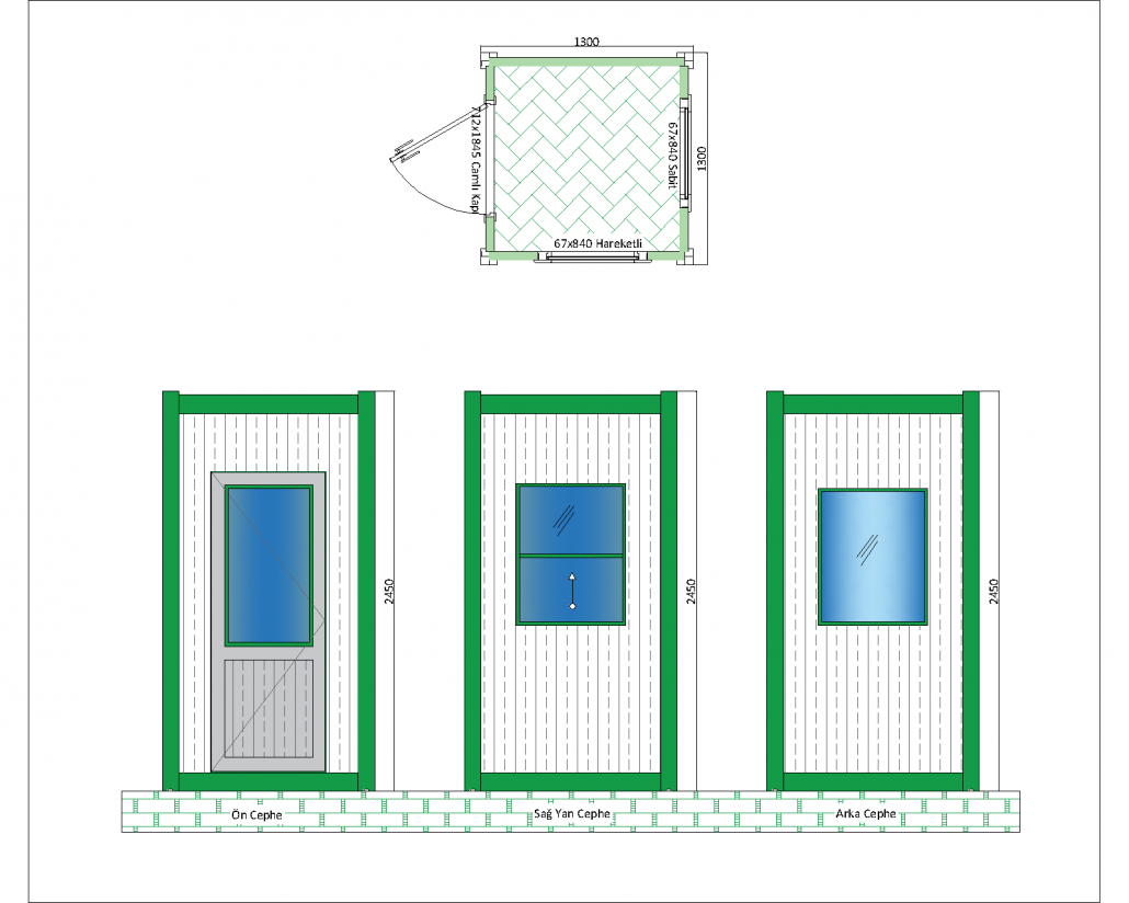 Kabin, ön cephede yer alan camlı bir kapı ile donatılmış olup, kapının boyutu 924×1954 mm’dir ve sağa doğru açılacak şekilde tasarlanmıştır. Sağ yan cephede 676×840 mm boyutlarında hareketli bir pencere bulunmaktadır, bu pencere havalandırma sağlar ve iç mekanda ferahlık sunar. Arka cephede ise sabit bir pencere yer alır ve doğal ışık girişini destekler.