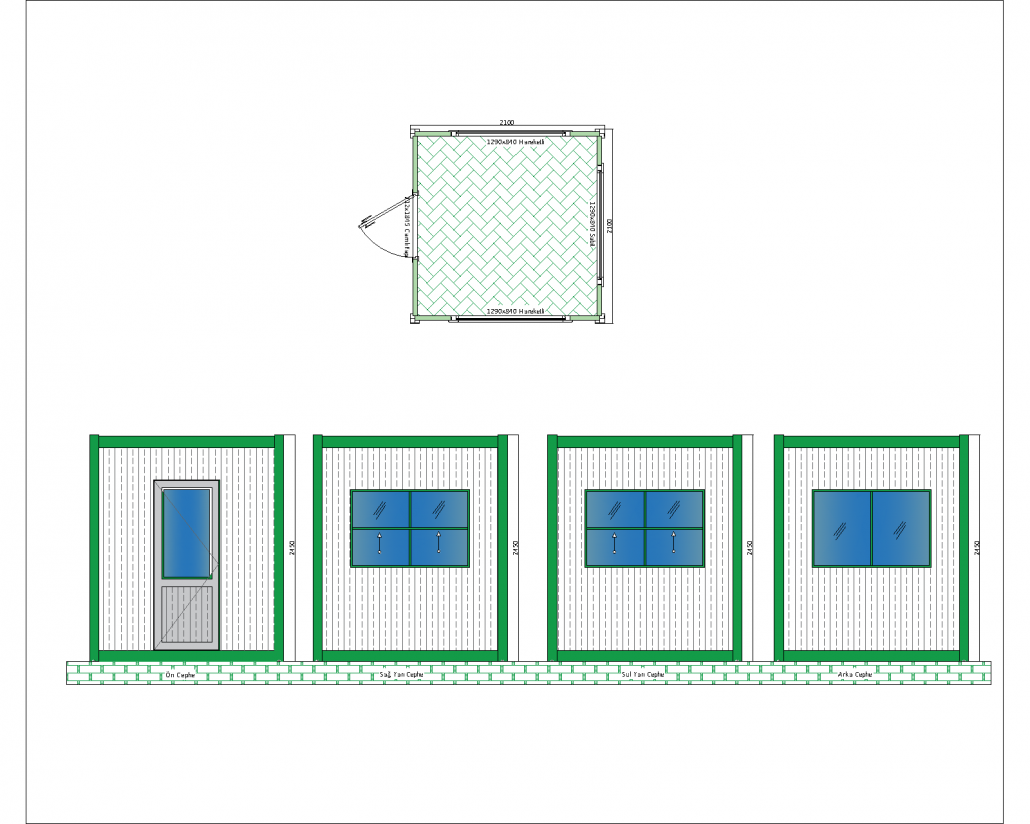 Ön cephesinde yer alan camlı kapı, hem giriş kolaylığı sağlar hem de iç mekana doğal ışık girmesine olanak tanır. Sağ yan cephede ve arka cephede büyük çift açılır pencereler bulunur. Bu pencere yerleşimi, iç ortamın gün boyu aydınlık ve havadar kalmasına yardımcı olur, aynı zamanda enerji tasarrufu sağlar.