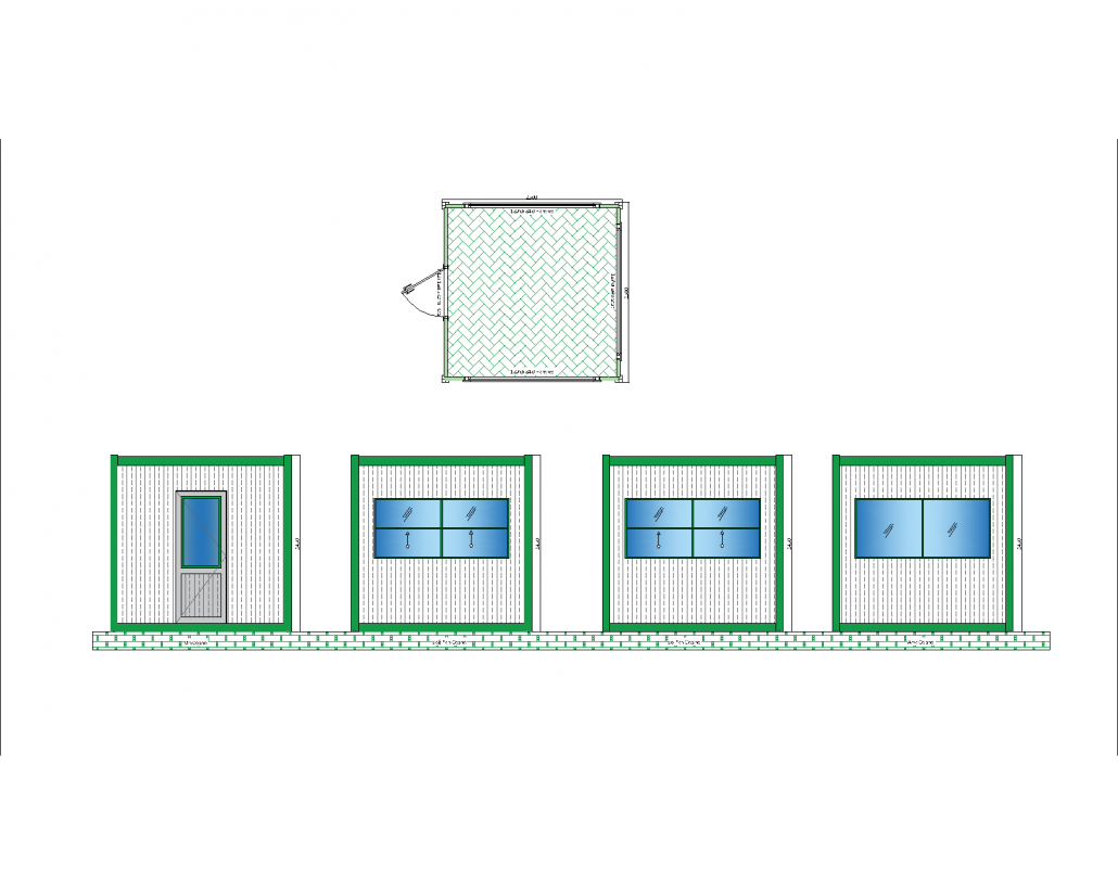 Bu panel kabin modeli, geniş iç alanı ve ferah pencere düzeni ile işlevsel ve pratik bir kullanım sunar. Yaklaşık 2,5×2,5 metre boyutlarında olan bu kabin, özellikle geçici ofis, şantiye alanı veya depo olarak kullanılmak üzere tasarlanmıştır. Ön cephedeki geniş camlı kapı ve yan cephelerde bulunan büyük pencereler sayesinde iç mekâna doğal ışık sağlanarak konforlu bir çalışma ortamı oluşturulur.