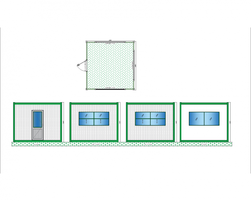 Bu panel kabin, fonksiyonel ve kullanışlı yapısıyla geniş bir iç mekan sunmaktadır. 3000x3000mm genişlikte tasarlanmış olan bu yapı, ofis, depo veya geçici yaşam alanı olarak çok amaçlı kullanılabilir. Önde yer alan kapı ve yan cephelerde konumlandırılmış geniş pencereler, içeriye maksimum doğal ışık girişi sağlayarak ferah ve aydınlık bir ortam oluşturur. Bu özellik, iç mekanın daha konforlu olmasını sağlarken, enerji tasarrufuna da katkıda bulunur.